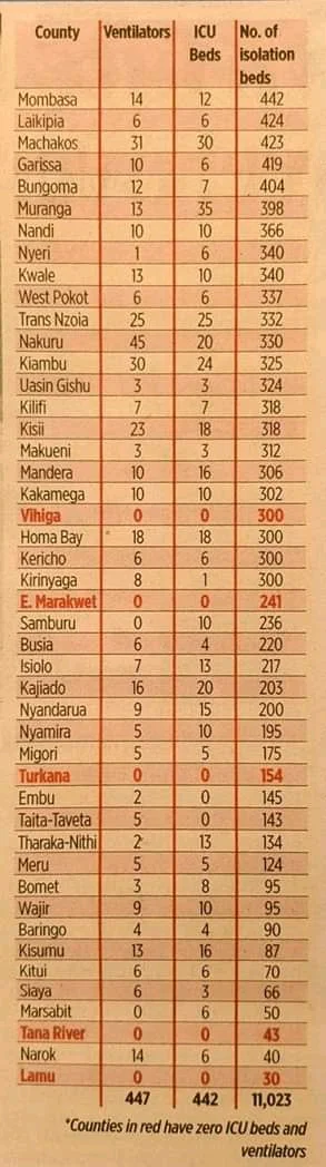 As you head back to your ancestral lands (read Counties) to hide from the economic fallout of Covid-19, imposed by your own government which has literally thrown you under the bus and left you to your own devices, here (👇🏿) is a rudimentary list of the number of Covid-19 ICU beds available there.